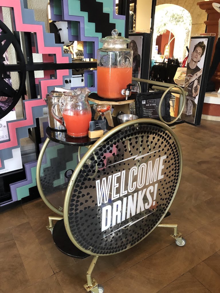 Upon your arrival at the resort, the bellman will take your luggage, ask for your last name, tag your bags and give you the other half of your ticket. Once you enter the lobby of Hard Rock Riviera Maya through the sliding glass doors, the cool air conditioning hits you and your welcome drink awaits! The vibe of the Hard Rock can be felt immediately after entering. There’s live music playing and amazing music memorabilia all over the lobby.